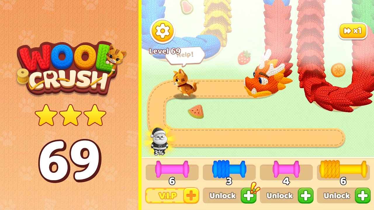 Wool Crush does not offer a direct "skip" option without spending in-game currency or watching an ad. The best approach is to use the walkthrough above to solve it step by step.